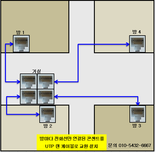 거실이나 방마다 인터넷 케이블이 연결되지 않고 전화플러그만 설치되어
