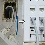 오래된 아파트 관로포설 작업입니다 벽에 전화플러그만 있어서 인터넷 사용이 불편하여 전화콘센트를 분리해보면 전화사용이 가능한 케이블만 있습니다 전화선을 철거하고 인터넷이 사용가능한 UTP케이블로 교환하는 작업입니다 전화콘센트를 인터넷 연결용 커버로 변경하였습니다..